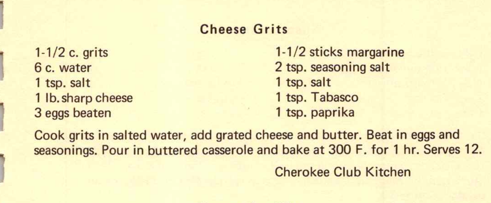 Cook grits in salted water, add grated cheese and butter. Beat in eggs and seasonings. Pour in buttered casserole and bake at 300 F. for 1 hr.