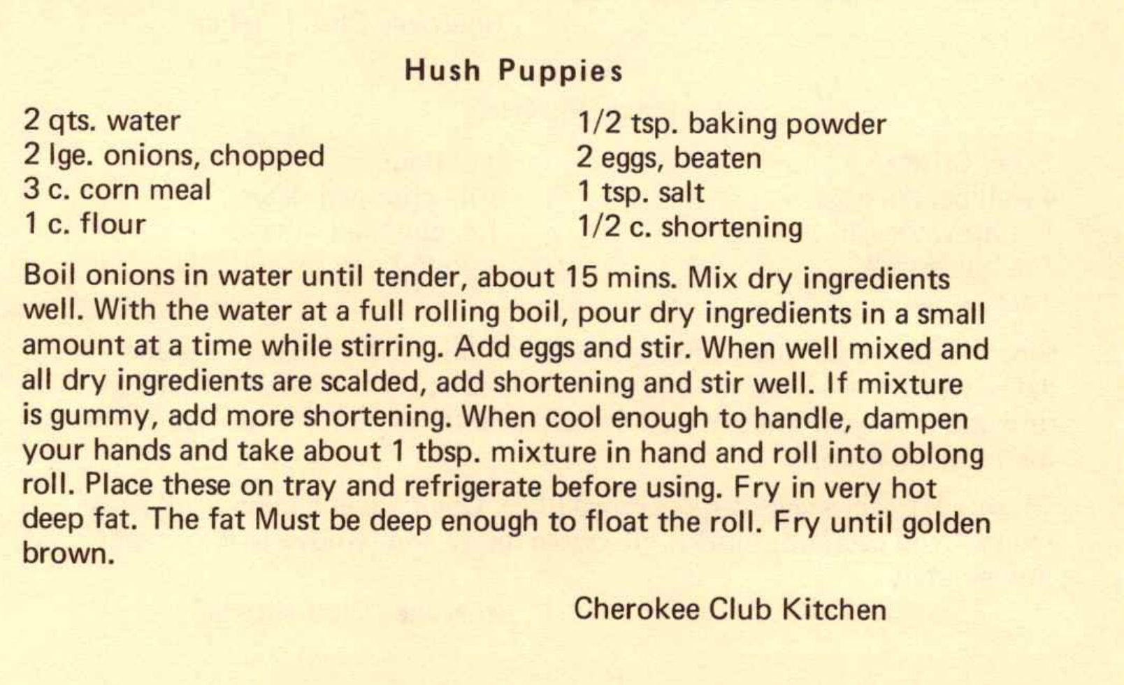 Boil onions in water until tender, about 15 mins. Mix dry ingredients well. With the water at a full rolling boil, pour dry ingredients in a small amount at a time while stirring. Add eggs and stir. When well mixed and all dry ingredients are scalded, add shortening and stir well. If mixture is gummy, add more shortening. When cool enough to handle, dampen your hands and take about 1 tbsp. mixture in hand and roll into oblong roll. Place these on tray and refrigerate before using. Fry in very hot deep fat. The fat Must be deep enough to float the roll. Fry until golden brown.