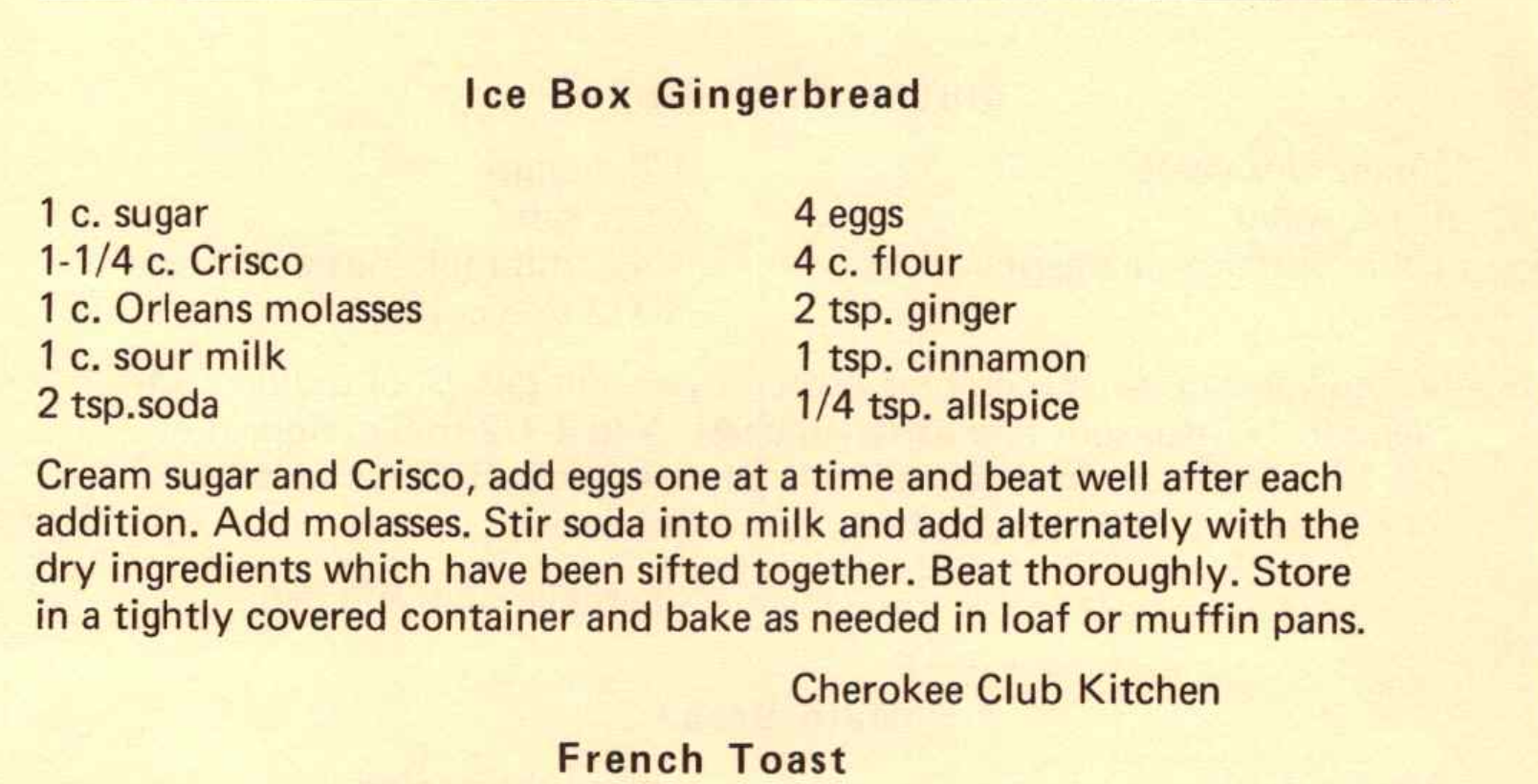 Cream sugar and Crisco, add eggs one at a time and beat well after each addition. Add molasses. Stir soda into milk and add alternately with the dry ingredients which have been sifted together. Beat thoroughly. Store in a tightly covered container and bake as needed in loaf or muffin pans.