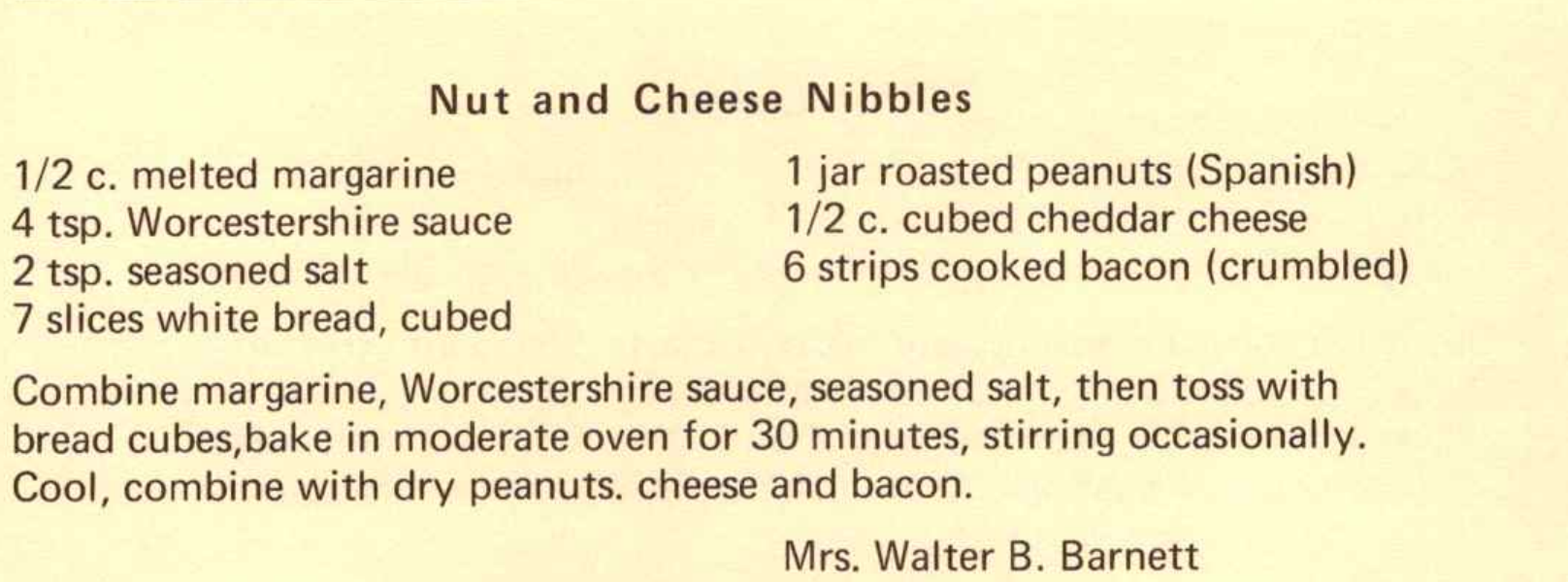 A savory appetizer combining toasted bread cubes with peanuts, cheese, and bacon.