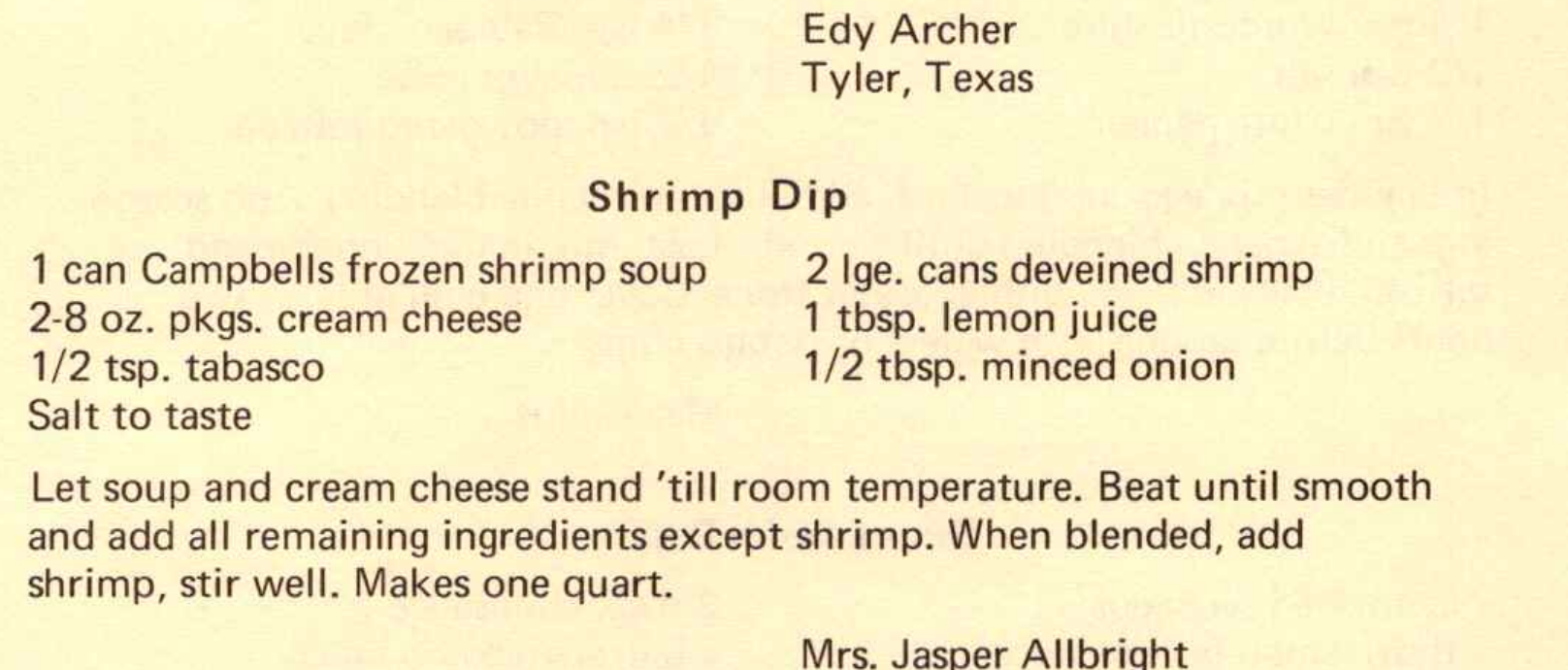 A creamy shrimp dip recipe from Edy Archer of Tyler, Texas, shared by Mrs. Jasper Allbright.